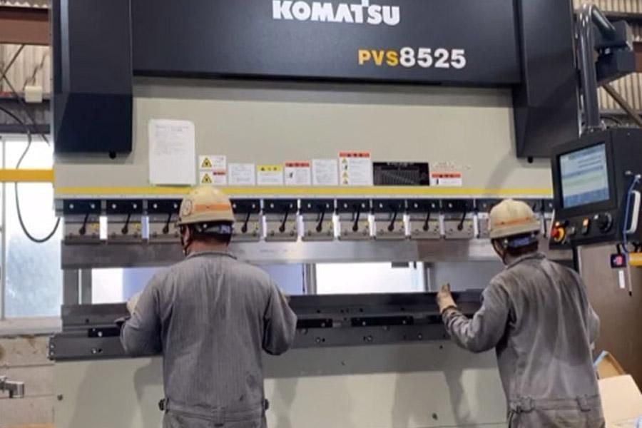 最大曲げ長さ2,570mm、加圧能力850kNまで対応するプレス曲げ加工です。 Komatsu PVS8525などの高精度プレスブレーキを使用し、厚板から薄板まで安定した曲げ精度を実現。 短納期対応・小ロット可。鉄・ステンレス・アルミなど多様な材質に対応します。